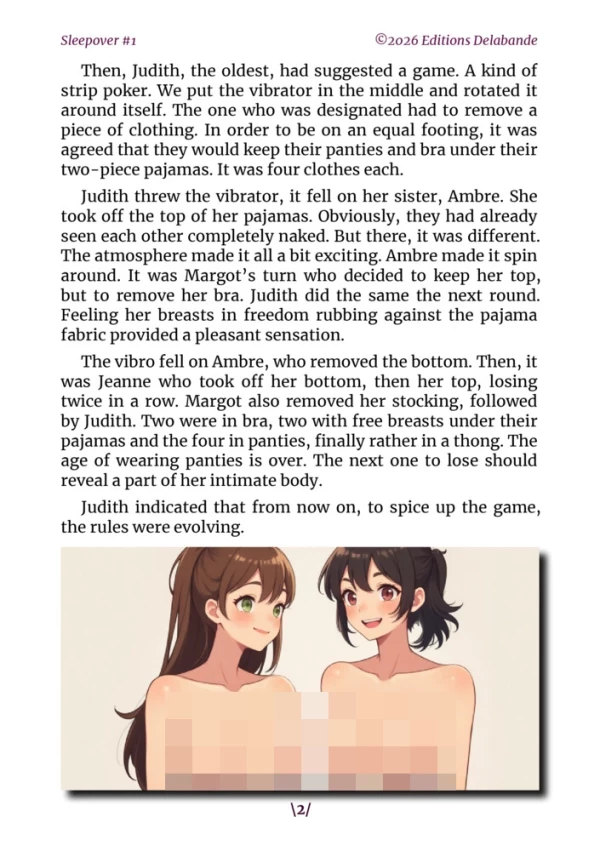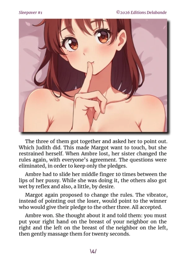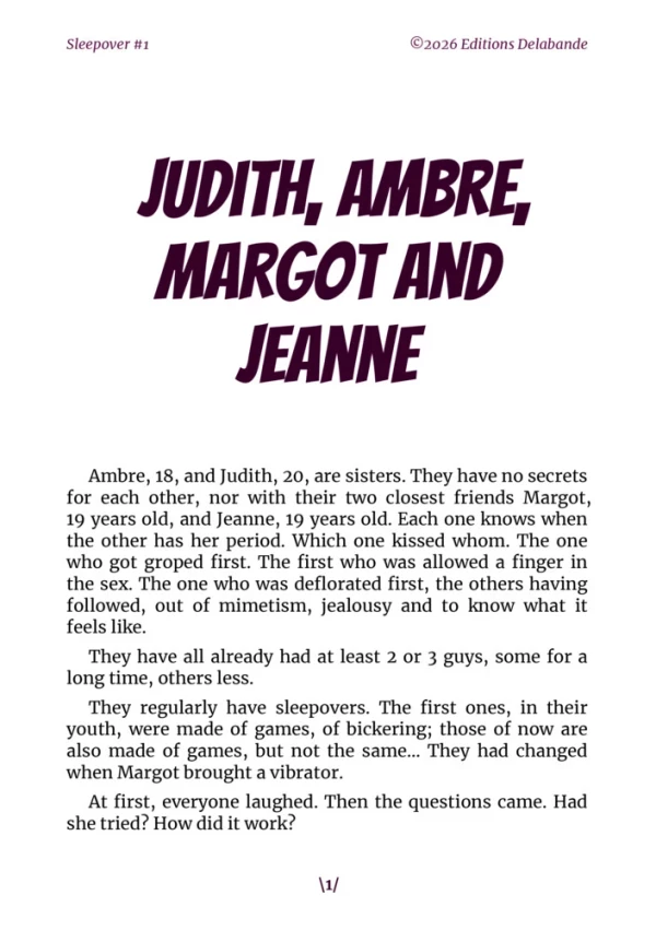 Stories of sleepovers that always begin in a lighthearted and carefree atmosphere, filled with laughter, casual conversation, and moments of shared intimacy. But as the hours pass, the atmosphere subtly shifts. Confidences become more personal, glances more intense, and certain boundaries begin to blur. What seemed perfectly innocent then takes an unexpected turn, giving way to bolder and deliciously unsettling situations. These unforeseen developments make each evening far more exciting than it anticipated. Each story is unique, driven by different characters, their desires, their hesitations, and the surprises the night holds.