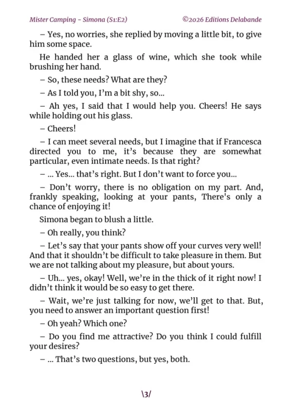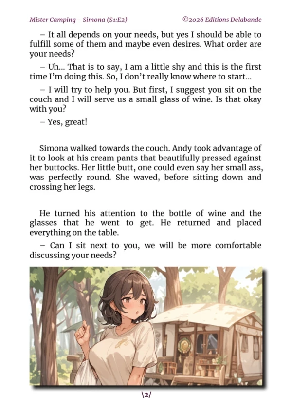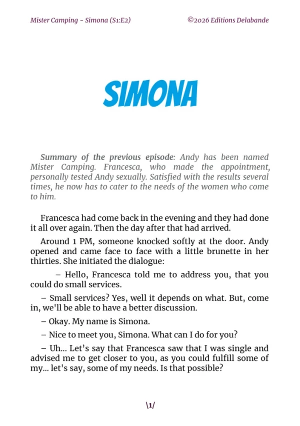 In episode 2 of Mister Camping, follow Andy's adventures, now known as Mister Camping for the next three weeks. Stationed at the heart of the campsite, he becomes the go-to person for women to confide their desires and expectations. They will come one after another, each with her own personality, desires, and specific needs. Simona will be the first to speak with him, paving the way for the fulfillment of her wishes. Discover how Andy, with his knack for service, will respond in his own unique way to these sometimes complex requests.
