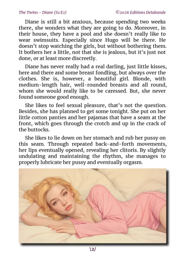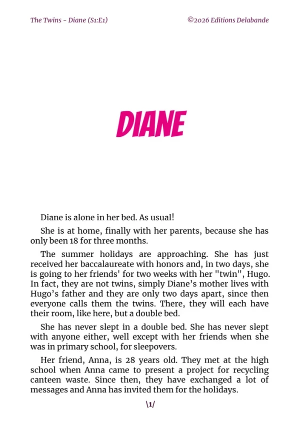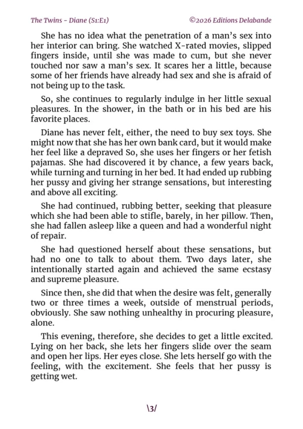 Meet Diane, a discreet young woman, somewhat solitary and always lost in her thoughts. Accustomed to the tranquility of her daily life, she has no idea that a simple disruption to her routine will turn everything upside down. An encounter, a glance, an unexpected event… all these elements will awaken new emotions within her, both unsettling and intoxicating. Little by little, Diane lets herself be carried away by this wave of sensations she has never known, oscillating between curiosity, fear, and the desire to finally dare. She is about to experience things she never even imagined, and nothing will ever be quite the same again.